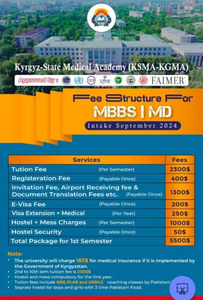KSMA offers a cost-effective MBBS/BDS program with annual tuition fees of approximately $4500 USD. The total cost for 5 years, including tuition, hostel, and mess, is around 95-98 lakh PKR, making it one of the most affordable options in Kyrgyzstan .